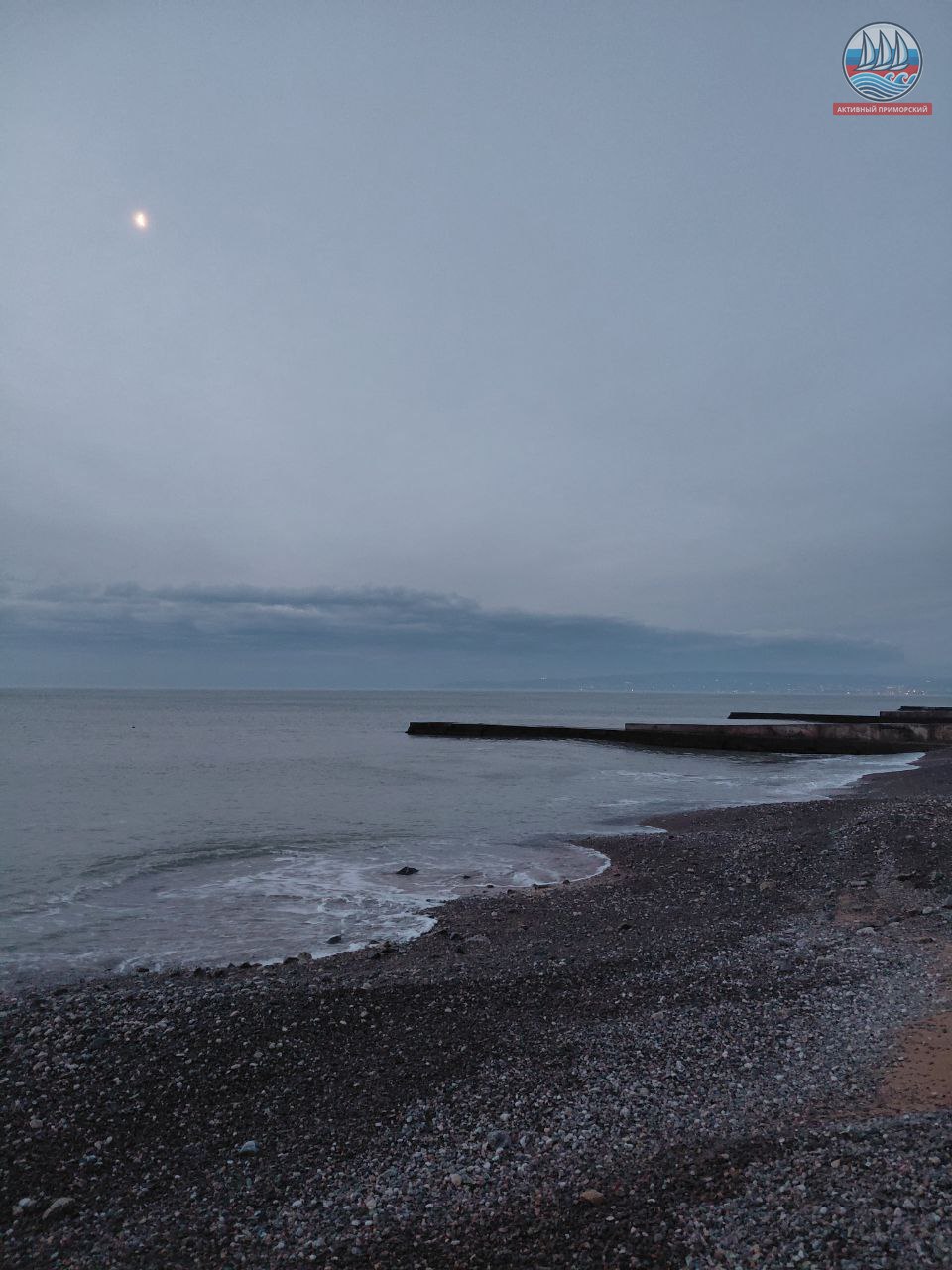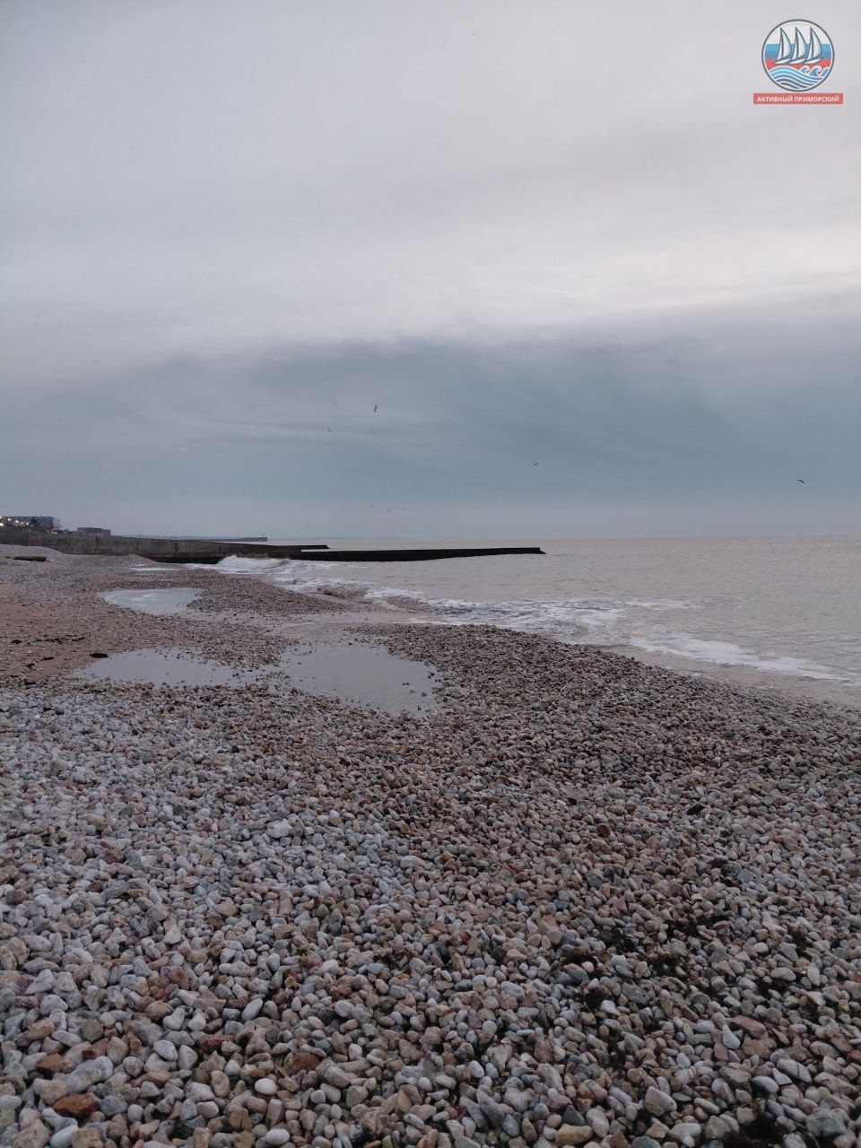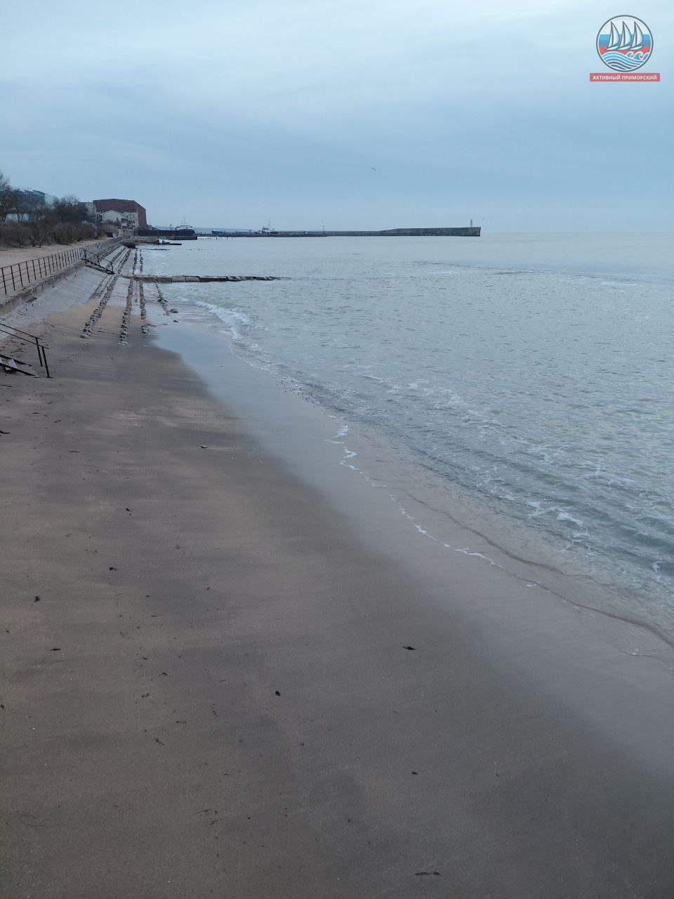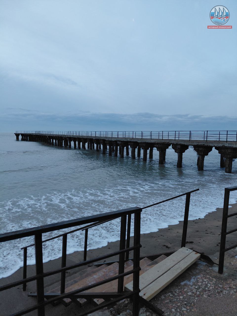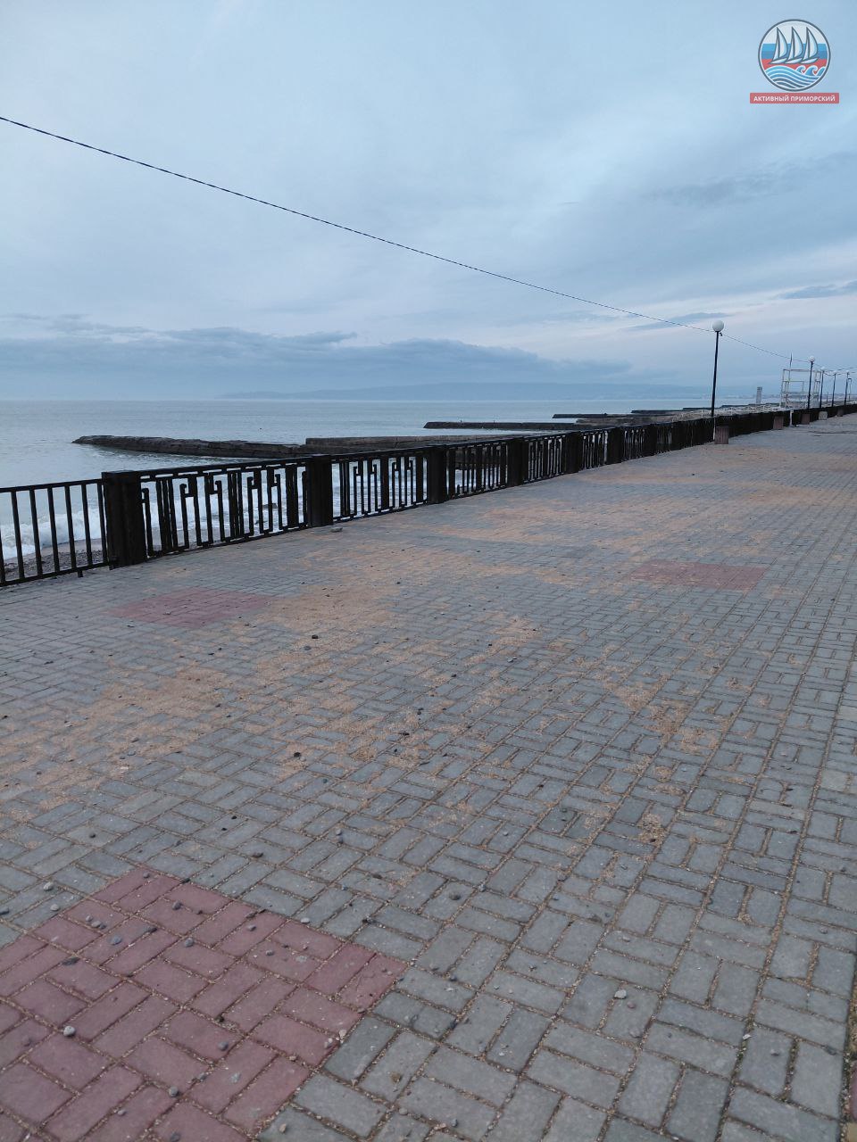 На старой набережной, чем богаты близлежащие пляжи — то песок, то галька. Слава Богу, что вчера поменялся ветер, а то могло бы случиться много проблем. А так где-то ограждение вырвало, урну унесло и лестницу, что слева от пирса, оторвало штормом. Надо бы всё поправить…