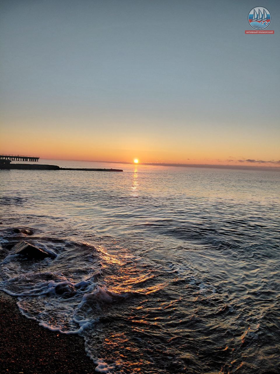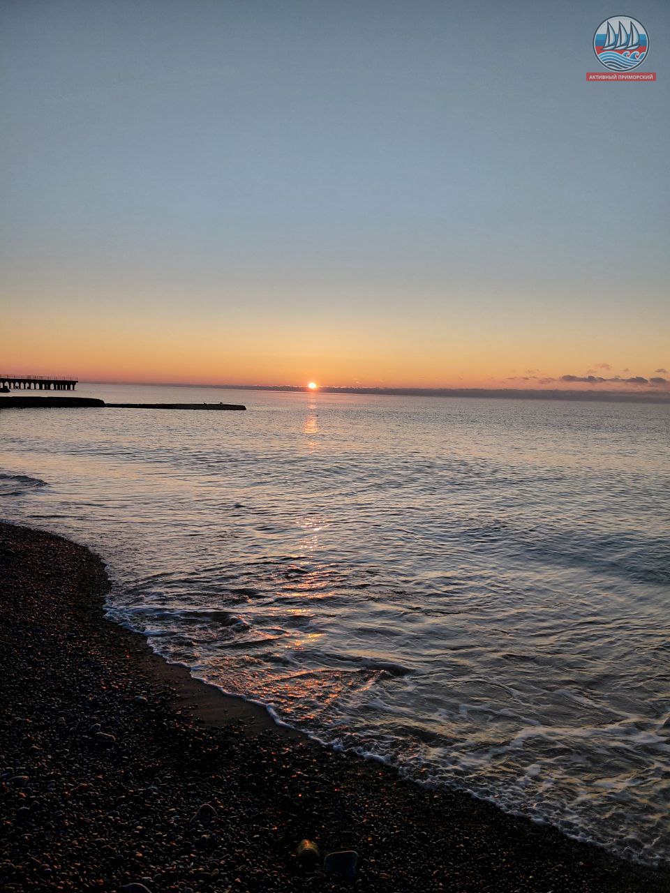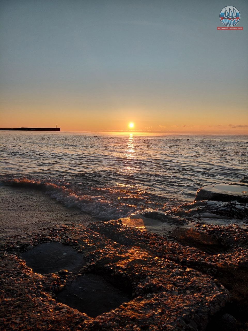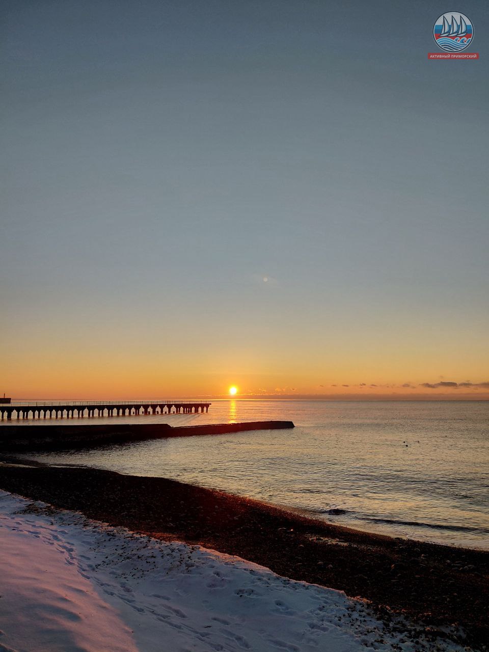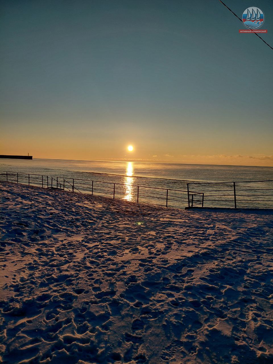 Солнце сегодня порадовало нас по расписанию! В положенное время яркий диск понемногу стал появляться из-за горизонта, даря приморчанам и нашим гостям свои волшебные лучи. Море всё сразу же засветилось, отражая эти яркие солнечные приветствия. Снег на берегу даже порозовел. И всё это через мгновение исчезло.