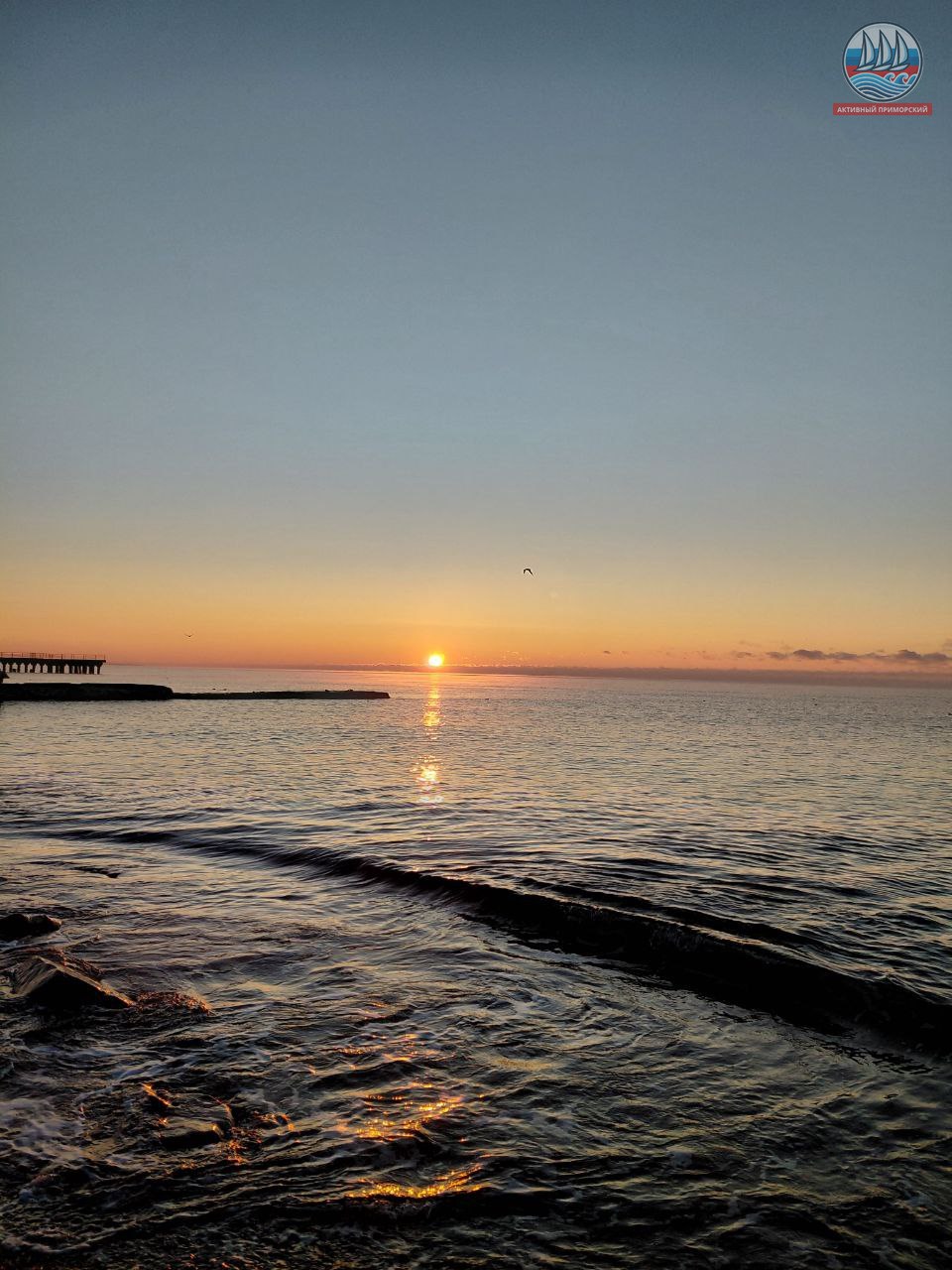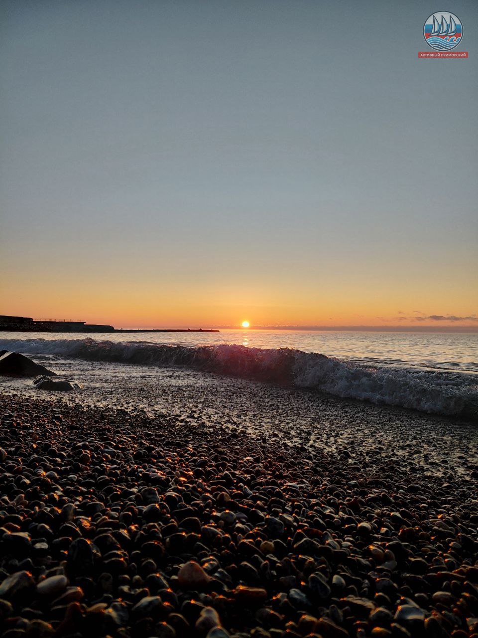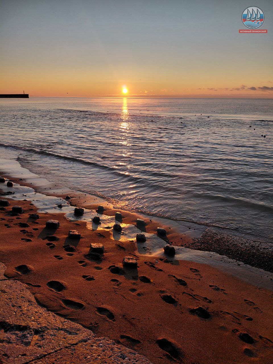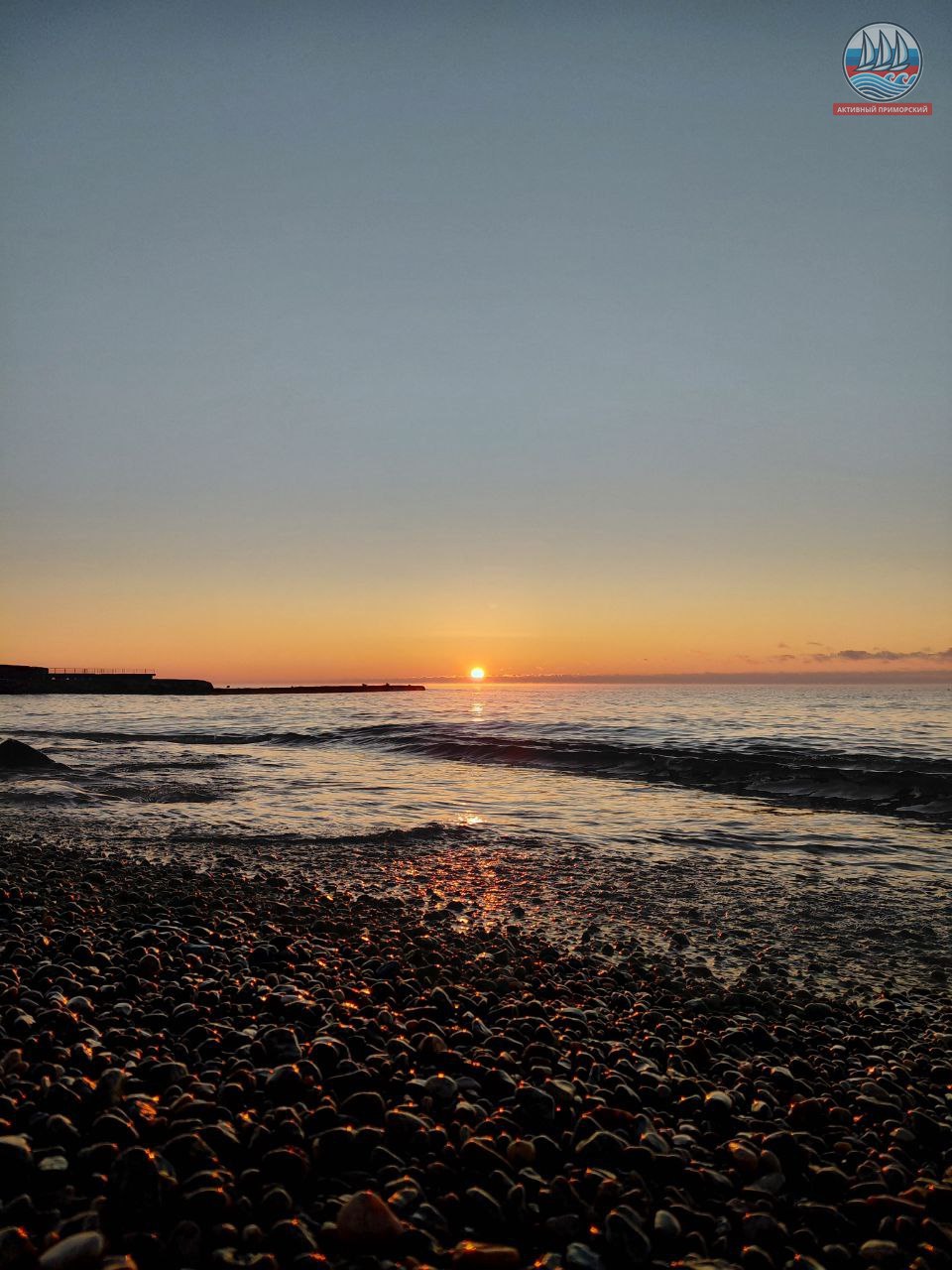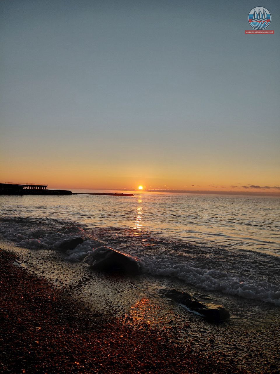 Солнце сегодня порадовало нас по расписанию! В положенное время яркий диск понемногу стал появляться из-за горизонта, даря приморчанам и нашим гостям свои волшебные лучи. Море всё сразу же засветилось, отражая эти яркие солнечные приветствия. Снег на берегу даже порозовел. И всё это через мгновение исчезло.