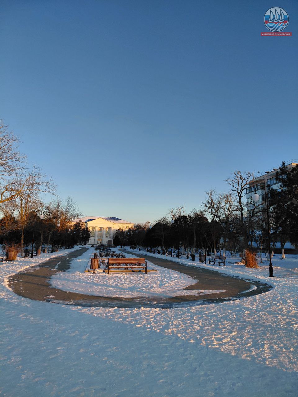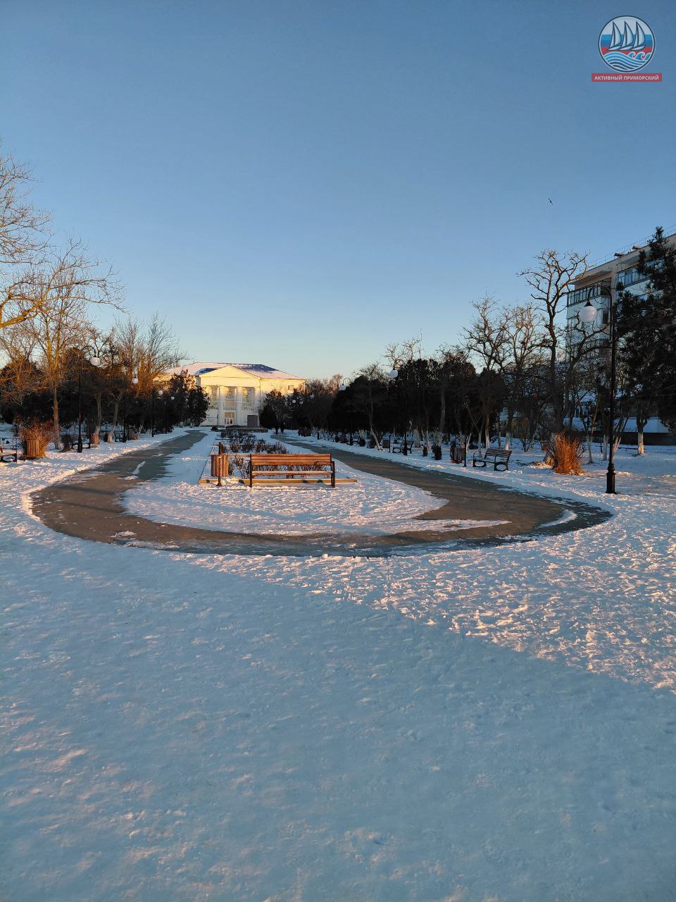 Чудесная дорожка, сделанная новой техникой у нас в Приморском во время снегопада перед якорями, выглядит через пару дней просто великолепно. По ней сейчас можно идти смело, не опасаясь растянуться в шпагате.