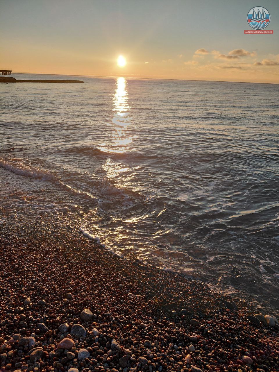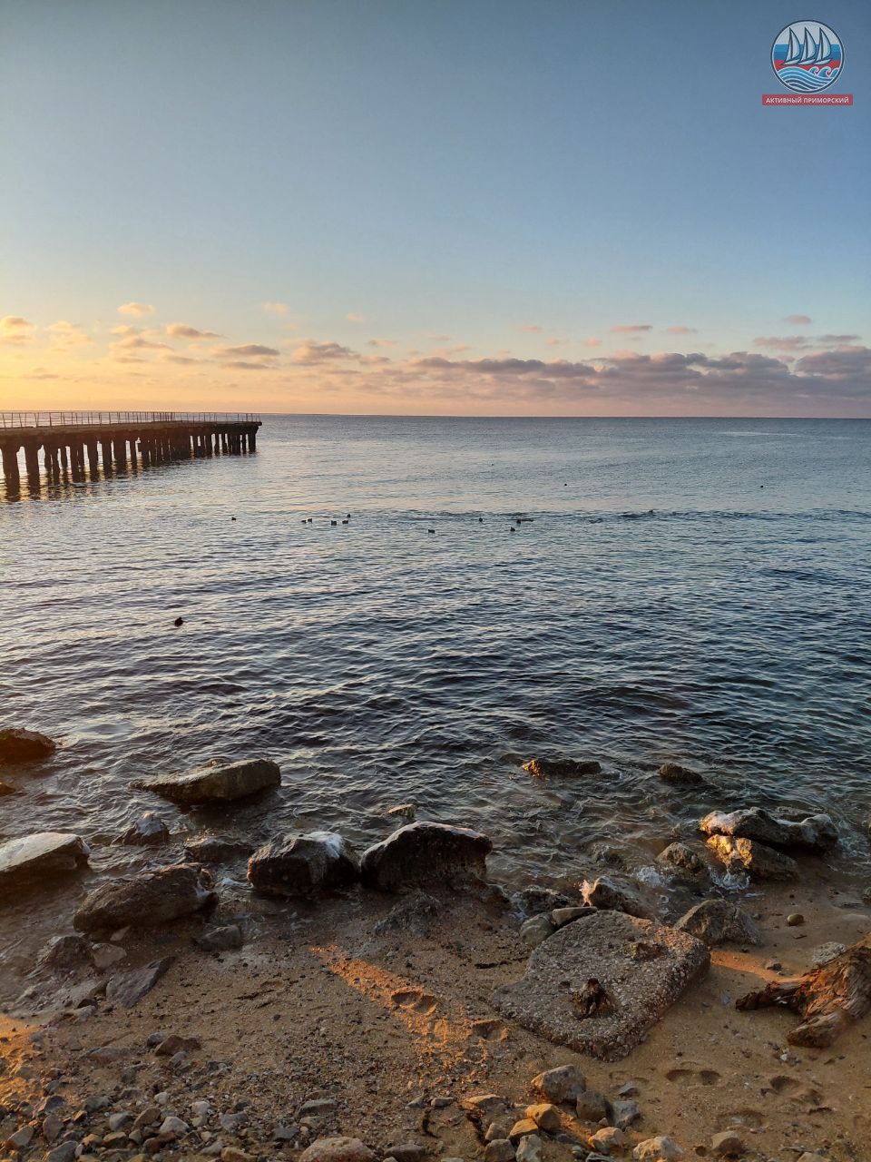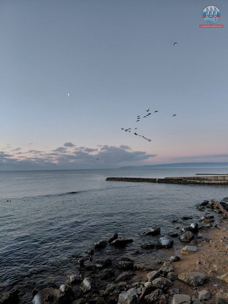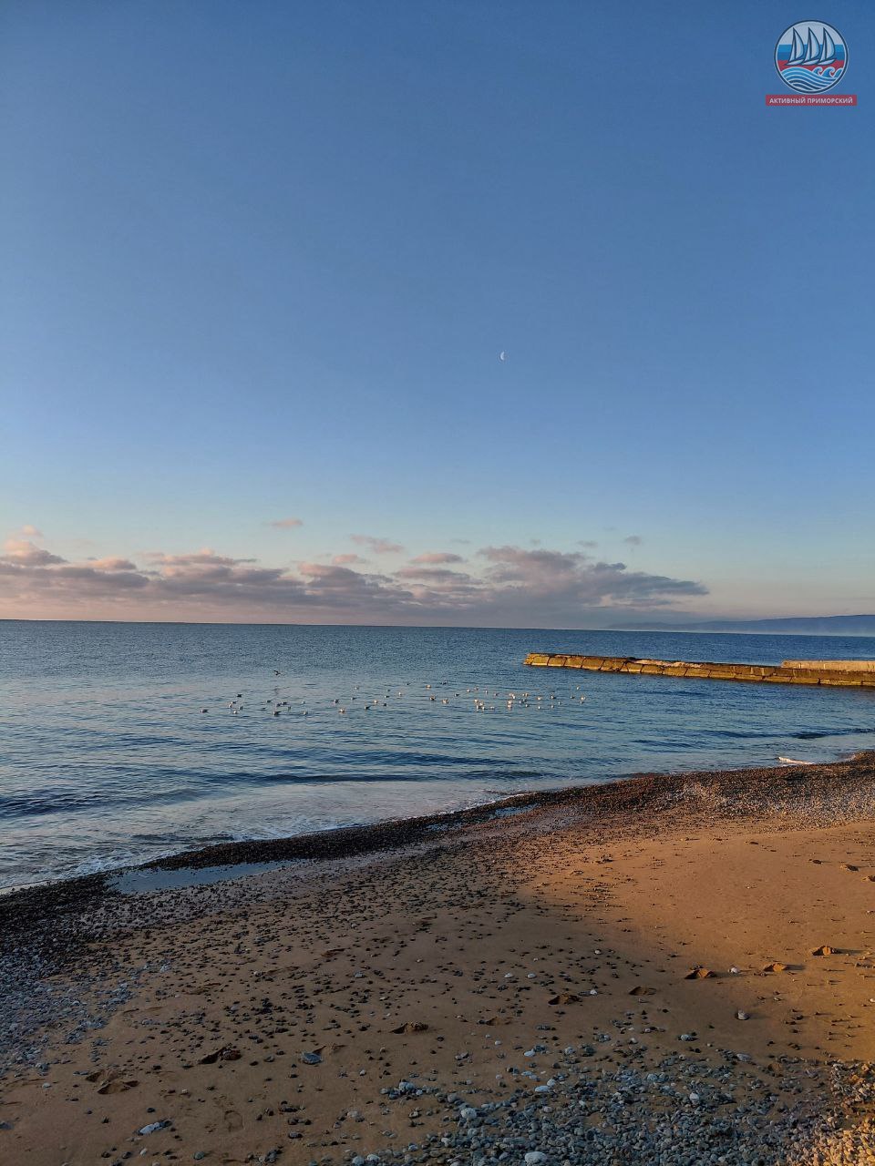 Ночь передала морозную эстафету, и утром было совсем холодно, -8, а по ощущениям ещё ниже. На берегу тихо, ни ветринки. Море потихоньку обсуждает с чайками завтрашнее потепление. На фоне чистого и голубого неба к нам на свидание вышло долгожданное солнце. Красиво!