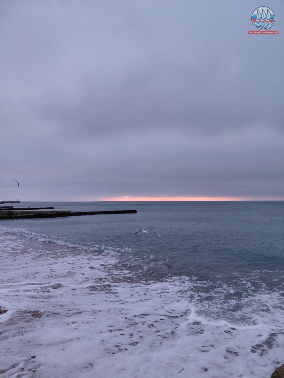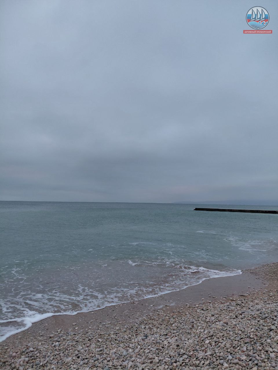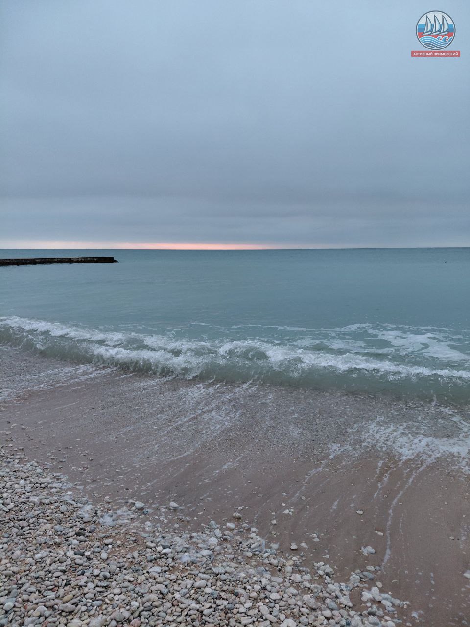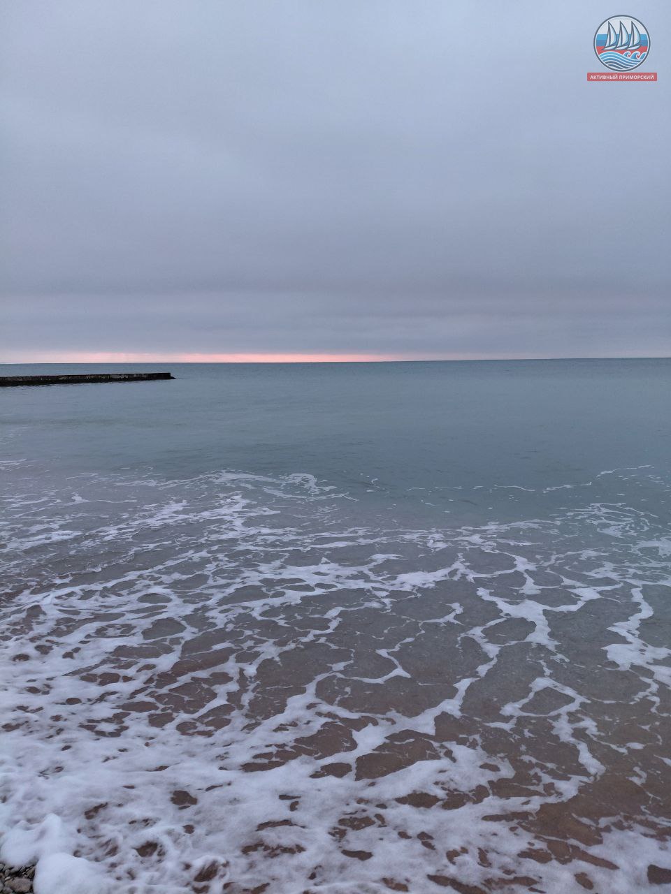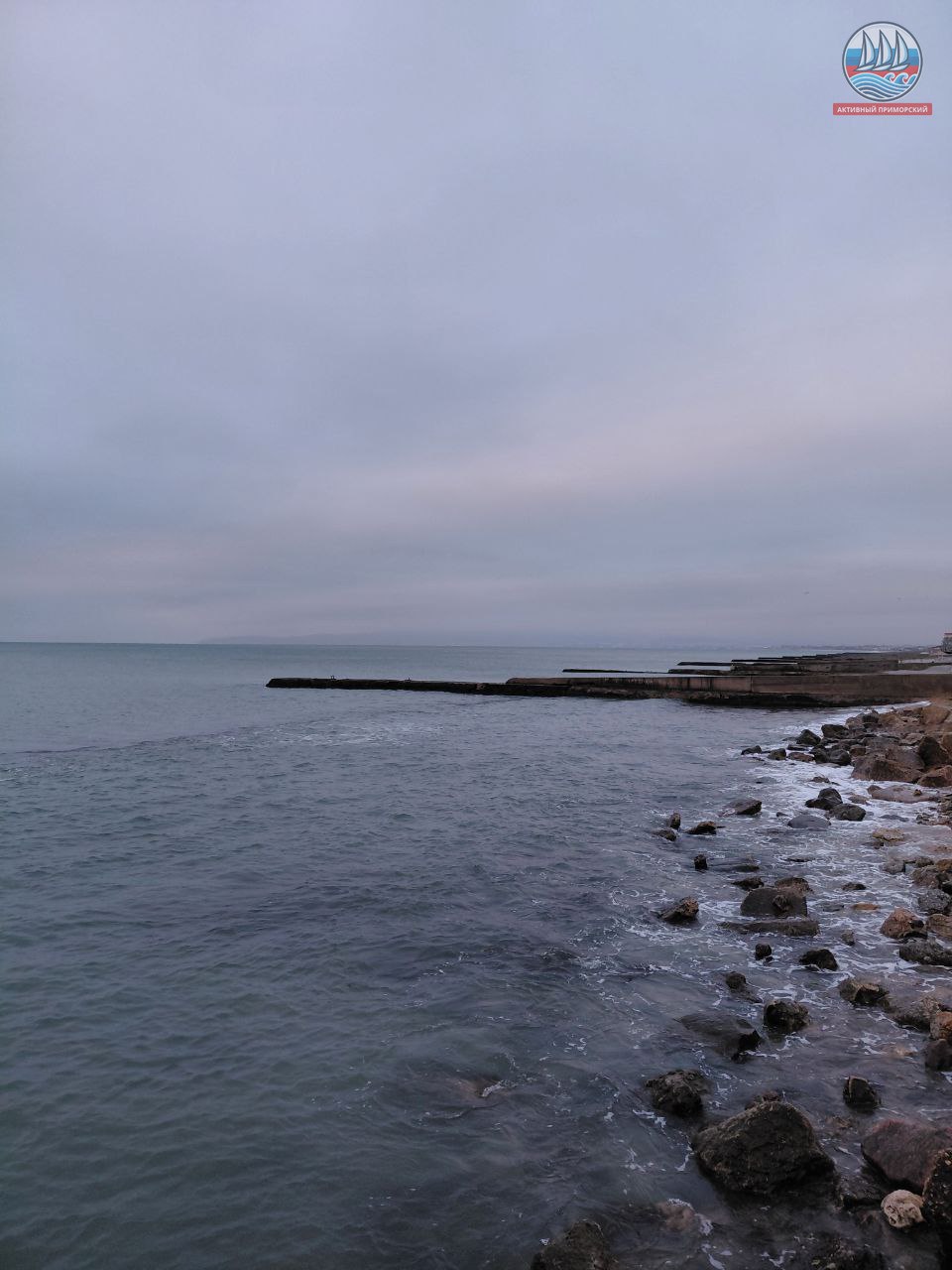 Сегодня ещё холодно, +1, а по ощущениям, как написано в прогнозе, -4. Руки реально стынут. Ветер. Всё вокруг серое, лишь яркая полоска на горизонте. Море слегка волнуется.