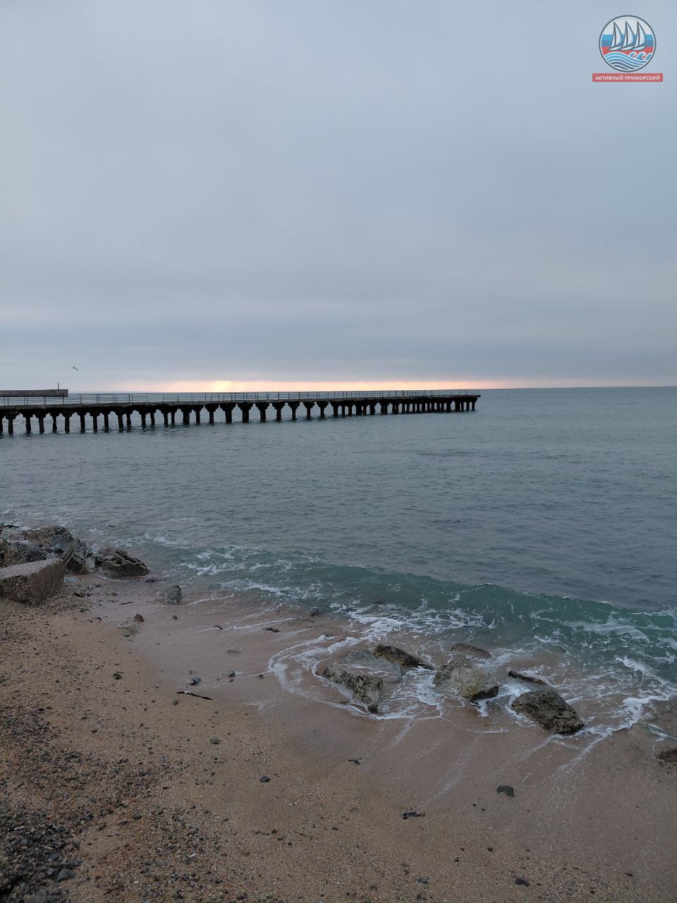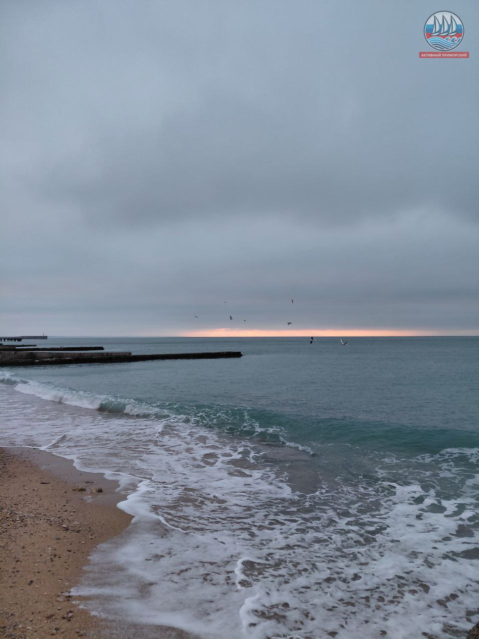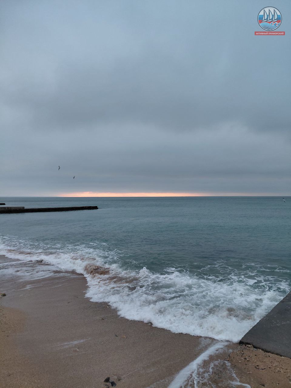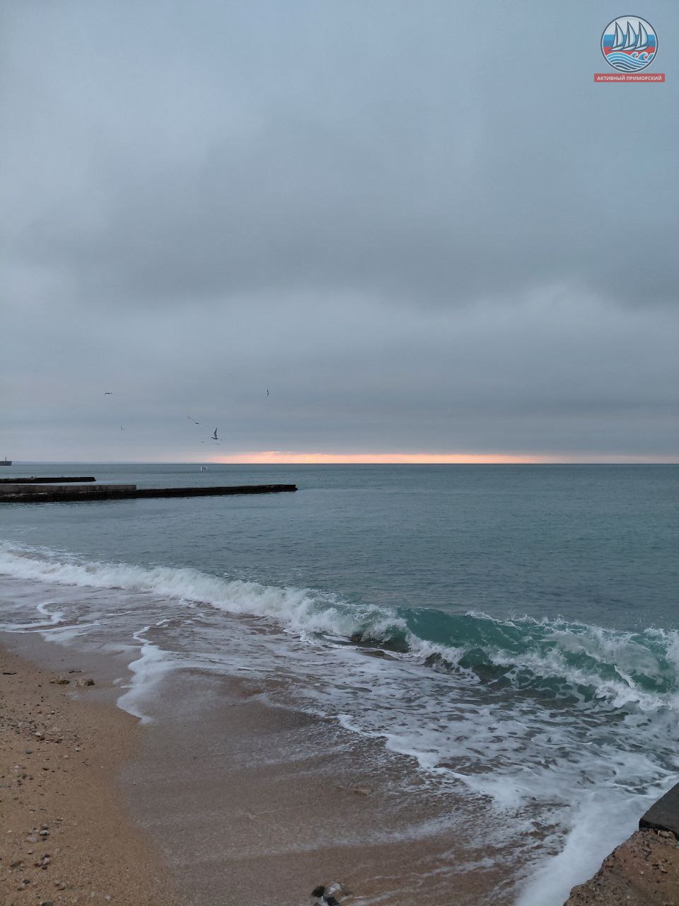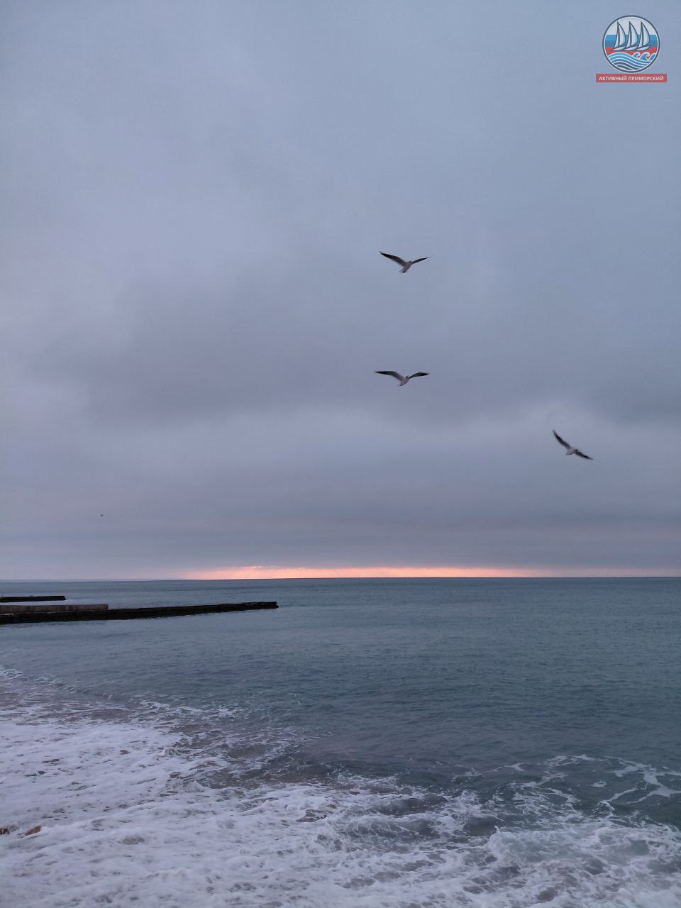 Сегодня ещё холодно, +1, а по ощущениям, как написано в прогнозе, -4. Руки реально стынут. Ветер. Всё вокруг серое, лишь яркая полоска на горизонте. Море слегка волнуется.