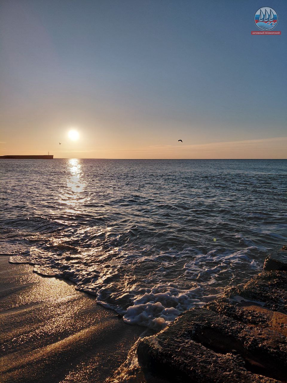 Восход солнца в Приморском состоялся. На календаре весна, но ещё с утра холодновато, +1, и ветерок. Море слегка перебирает небольшими волнами. Чайки летают. Всё в ожидании скорейшего тепла.